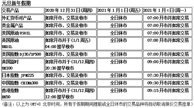 因应各地市场圣诞节假期及元旦新年假期影响,以下产品的交易时间将于假期期间提早和全日休市,敬请阁下留意知悉!